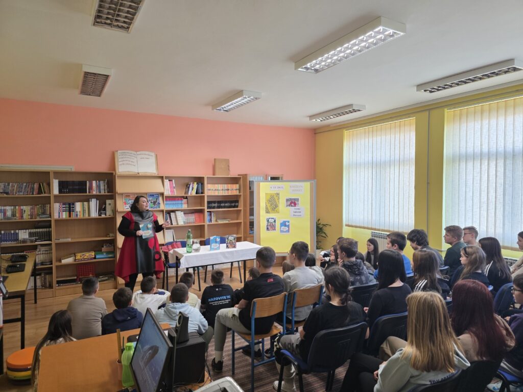 U prostoru školske knjižnice okupili su se učenici 6. i 7. razreda koji su zajedno sa svojim učiteljima, stručnim suradnicima i zamjenicom ravnateljice upijali svaku riječ ove zanimljive i duhovite književnice.